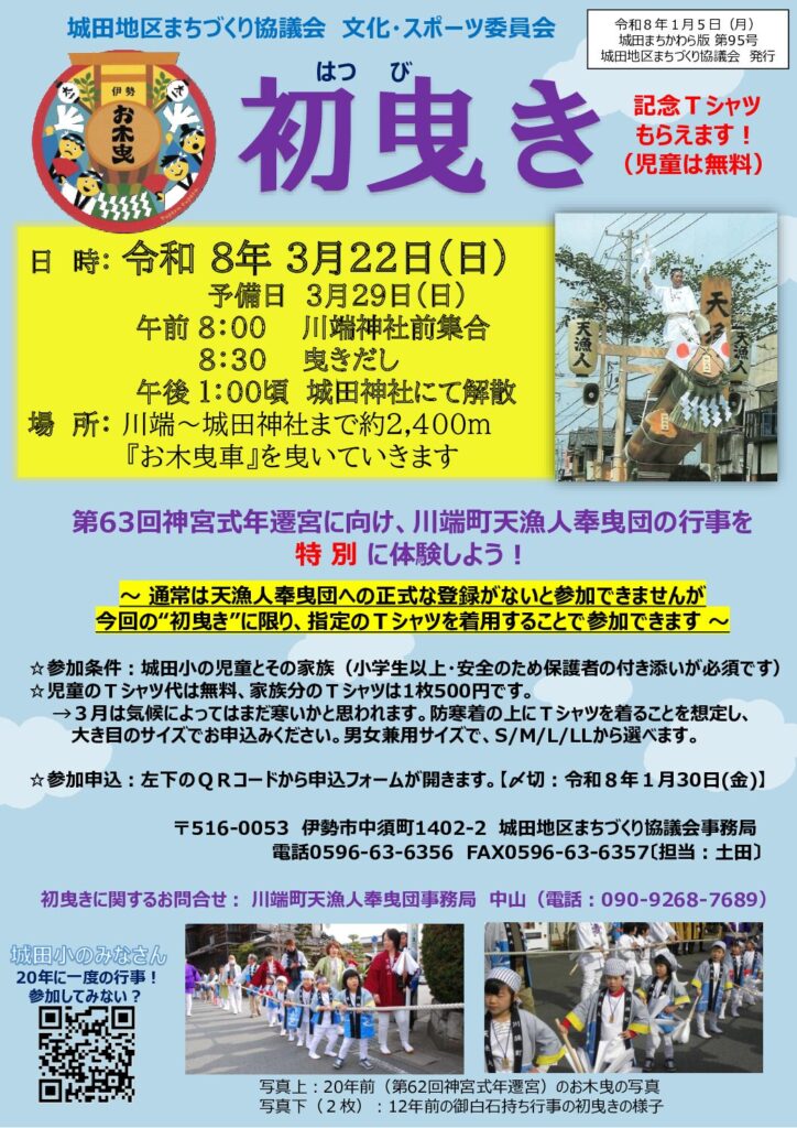 初曳き!たくさんの参加申込ありがとうございました! 投稿日 2026年1月29日 更新日 2026年2月2日 著者 kidamati カテゴリー BLOG カテゴリー NEWS カテゴリー 地域の話題 カテゴリー 文化・スポーツ委員会 計24組、77名です。天漁人奉曳団の団長も大喜びです。式年遷宮に向け、どんどん地元から盛り上げていきましょう!
